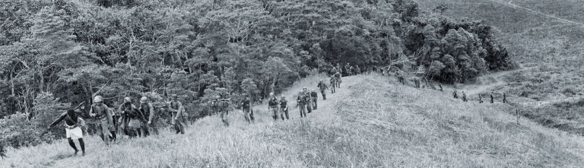 On November 6, the Raiders, accompanied by 150 native scouts and porters, set out for the Bokokimbo River in a snaking, mile-long line. Rolling coastal hills and plains gave way to condensed, dark green jungle interspersed with sunbaked clearings. Beyond the jungle loomed a jagged blue-green spine of volcanic peaks, some towering nearly 8,000 feet. The Bokokimbo was 10 miles away, but the men’s heavy packs and the thick “wait-a-minute vines,” razor-sharp kunai grass, swollen creeks, and muddy swamps slowed their progress. The Raiders covered only five miles that day, prompting their lean, hawk-faced commander to take the lead and accelerate the pace. Evans Carlson was an impatient man and he had much to prove—for himself and for his Marine Raiders.