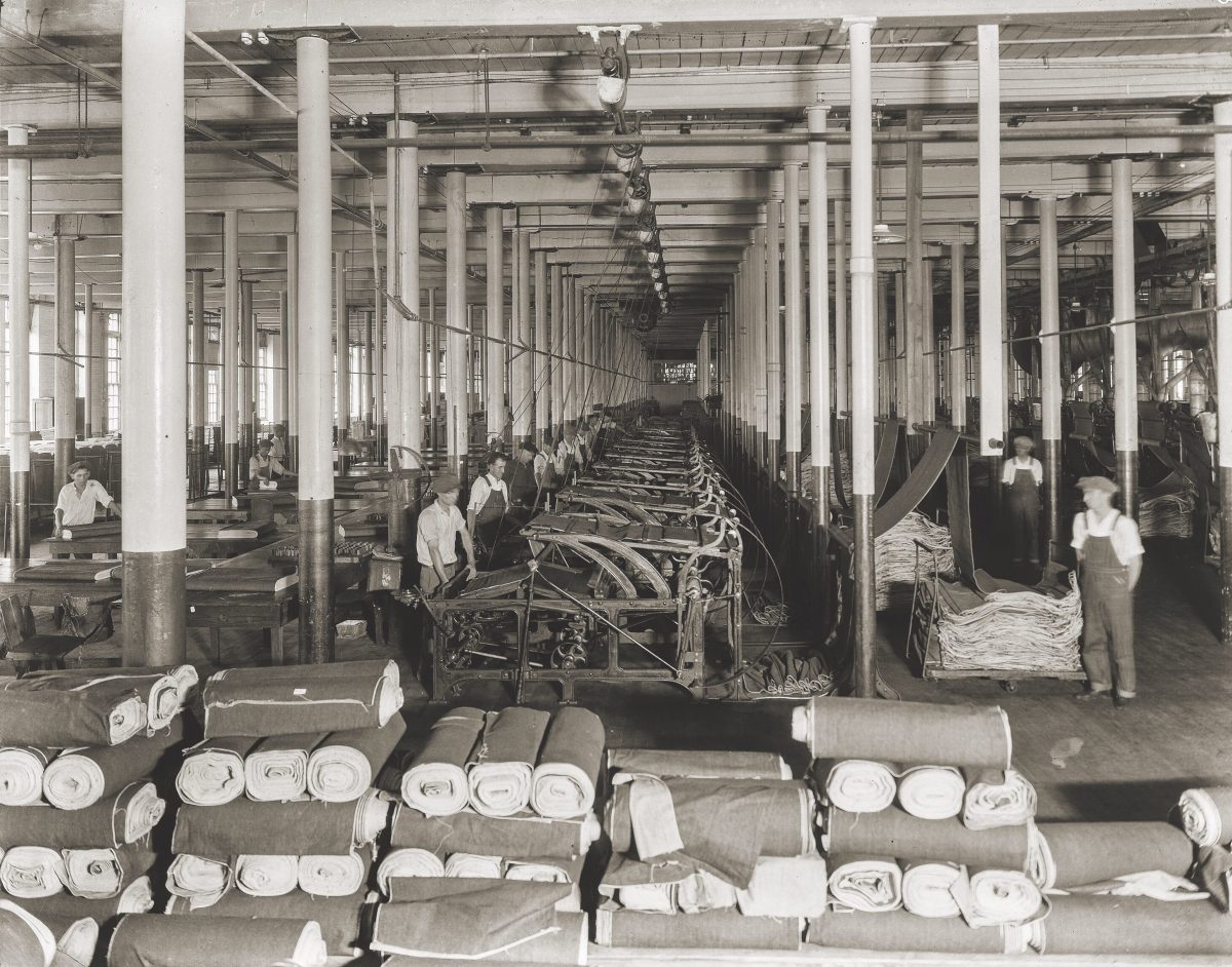 In 1884, Herman Cone turned his business over to Moses and Ceasar. Trading with mills, where owners of company stores short on cash often relied on barter, the brothers ended up owning stocks of cotton. Investing in textile mills around Asheville, North Carolina, the Cones also contracted with millers willing to guarantee a standardized product. By the 1890s, some 47 of North Carolina’s and Georgia’s 50 mills had joined the Cone Export and Commission Company, nicknamed “the Plaid Trust” after the favored weave, and were paying the brothers a 5 percent commission on sales. In 1895, the two opened Proximity Mill near a train line in Greensboro, North Carolina. Moses chose Greensboro not only for its six rail lines and access to cotton but its legacy as a Quaker town kinder to Jews than rival Winston-Salem. In 1900, the brothers partnered with others to open Revolution Mill, the South’s first cotton flannel mill, also in Greensboro. In 1905, the Cones opened 1,000-loom White Oak mill, churning out sturdy denim fabric. The Cones were generous employers and neighbors, endowing housing, schools, gardens, and medical care. In 1899, Moses Cone led the list of donors underwriting what became Appalachian State University. But the Cones also opposed unionization. After crushing a strike in 1900, the brothers began requiring their employees to sign company loyalty oaths.