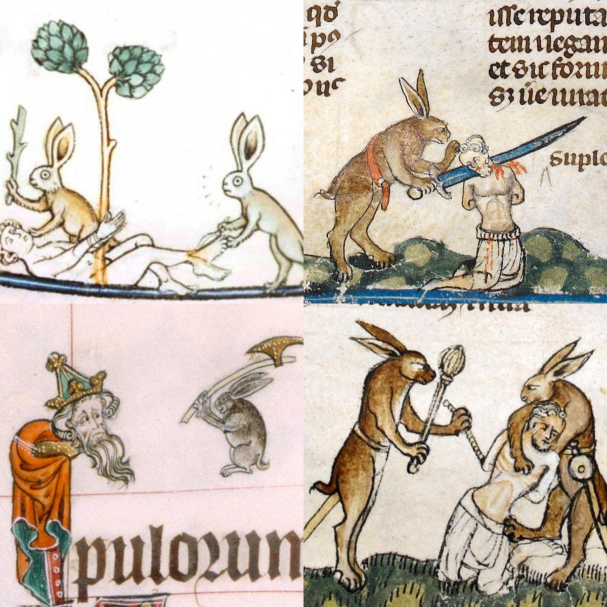 Scrawled into the margins of these 14th century texts are images of rabbits riding lions, snails, mythical beasts, hapless humans, and even an occasional woodpecker. Other bas-de-page scenes depict sword-wielding rabbits mutilating knights and other poor citizens who had the misfortune of running across the murderous Leporids.