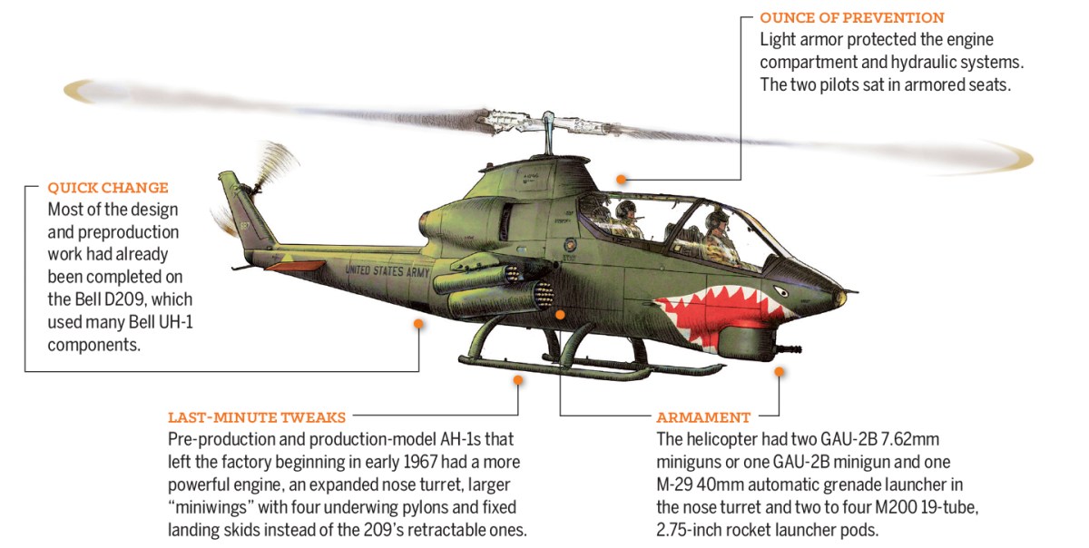 Bell Helicopter Co.’s D209 design, presented as a modified UH-1, was selected in August 1965, and the first prototype flew on Sept. 23, 1965. Flight tests and an Army evaluation led to modifications in the initial design. Four pre-production models were finished by late October 1966.