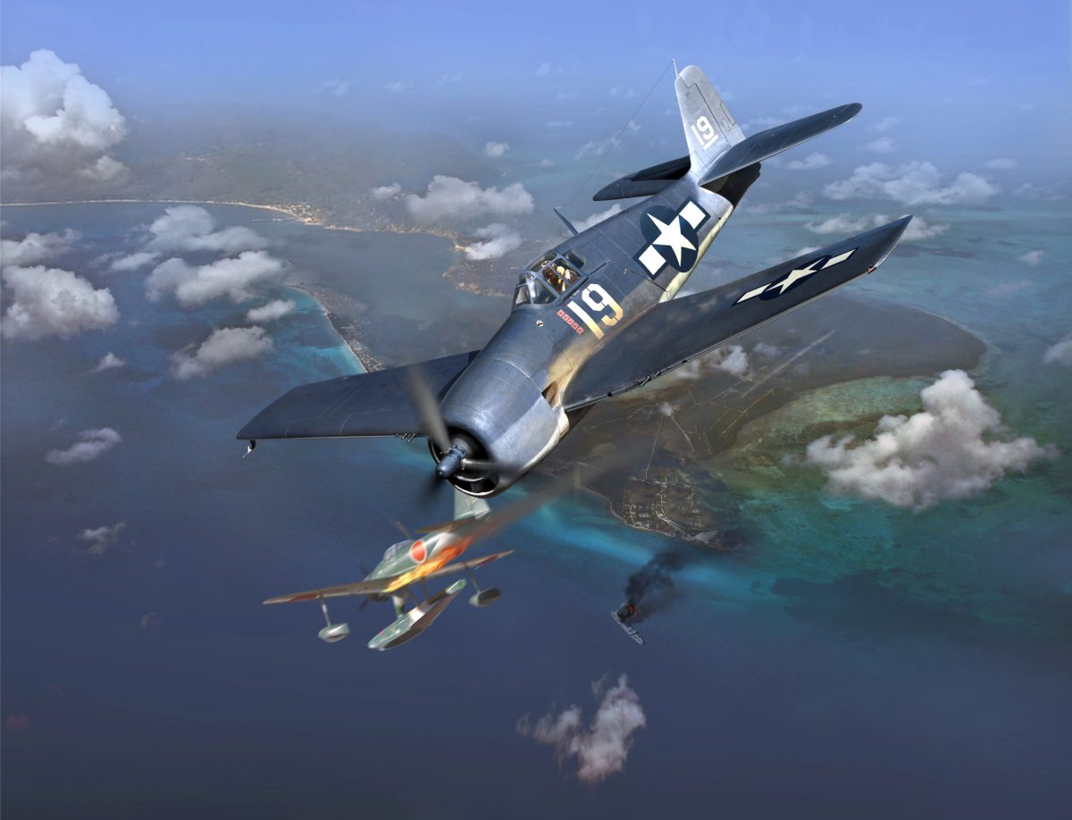 Intrepid’s next stop was vaunted Truk Atoll in the Carolines, Japan’s major naval air base in the central Pacific. Five carriers launched 72 Hellcats, initiating one of the classic dogfights of the war. As Vraciu prepared to dive on Truk with Ensign Lou Little, he recalled O’Hare’s advice and checked his 6 o’clock. Several Zeros had altitude and position, and one was firing. Vraciu called a warning and turned into the threat. Confusion permeated the cloud-flecked sky as one Hellcat shot another into the water. But in the frantic, twisting combat Vraciu expertly gunned three Zekes and a Nakajima A6M2-N Rufe floatplane, raising his tally to nine. Then he handed off a Zero to Little, who added to the squadron’s 16 kills that day.