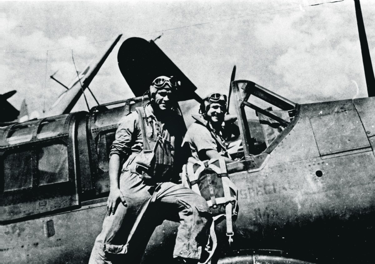 Griffin’s Helldiver had 83 holes in it, and the hydraulic cylinder in the starboard wing was blasted out. A bullet had passed just behind his back, leaving a crease in his parachute harness padding. Fortunately his backseater, Eno Leaf, was fine.