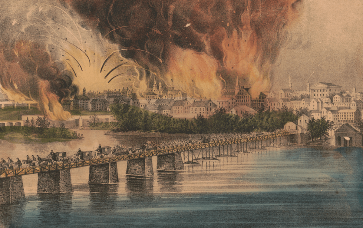 Finally, the South Carolina Cavalry approached from the southeast, the rear guard of Lee’s army. As the last of the men rode across the bridge, the officer shouted to the chief engineer, ‘All over, good-bye, blow her to hell!’ The barrels of tar placed along the bridge were torched, and soon the flames were shooting high into the air above the bridge.