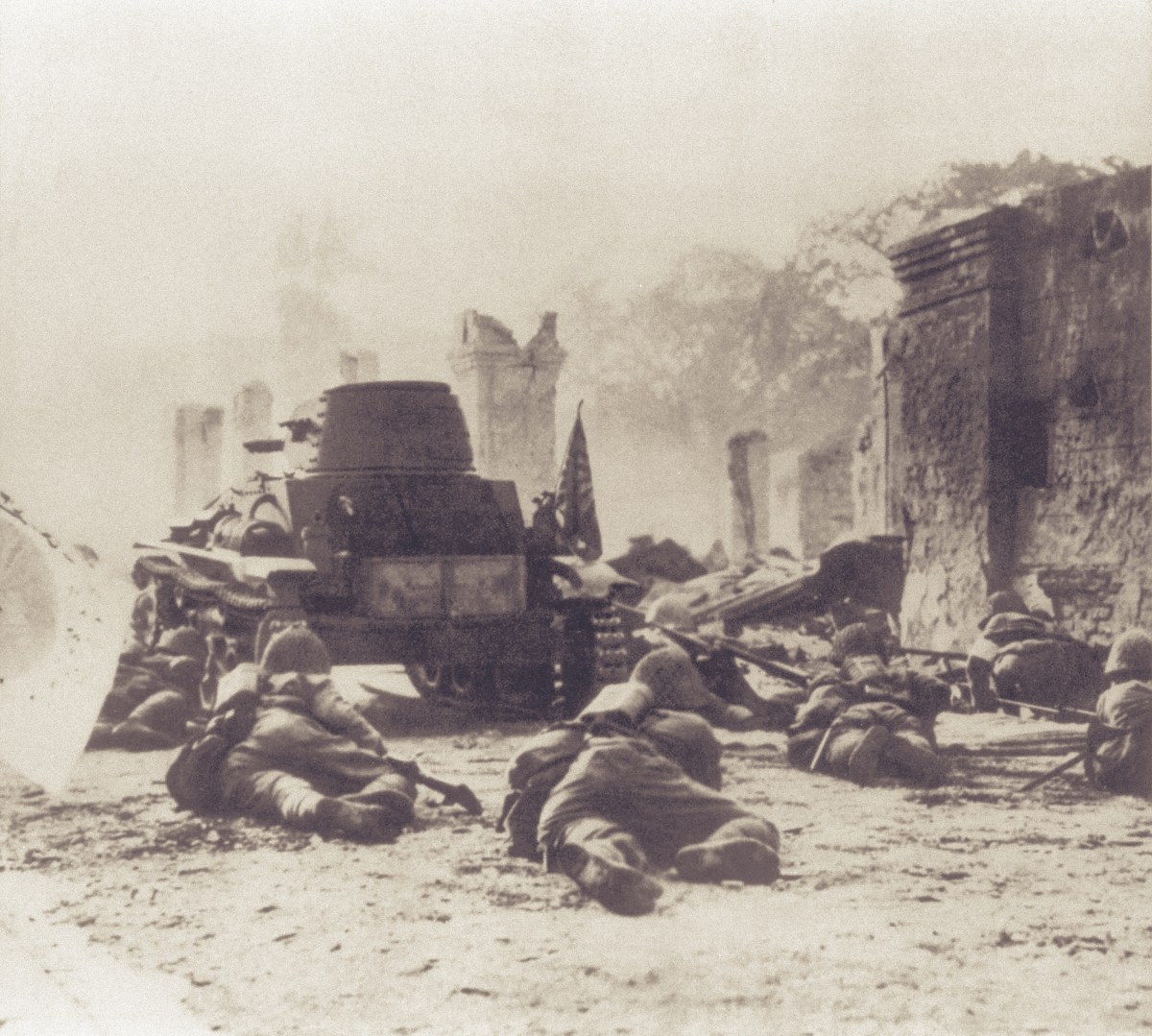 Gentry reported that the turrets of the Japanese tanks could traverse only a few degrees, although in theory they were fully traversable. It’s likely that the Japanese gunners, un-trained in tank-to-tank combat and stunned by the surprise tank attack, simply could not hand-crank their turrets quickly enough to follow the speeding American M3s, which sustained no damage from the Japanese tank guns. The careening tanks did considerable damage to the barrio, smashing through the bamboo huts and setting them on fire with tracers, and knocking great chunks of masonry off the permanent buildings. The equestrian statue of the Filipino revolutionary leader Andrés Bonifacio that dominated the town square lost its head to a shell fired by a sergeant who told Sergeant Allen later that the head was an aiming point for sighting his cannon.