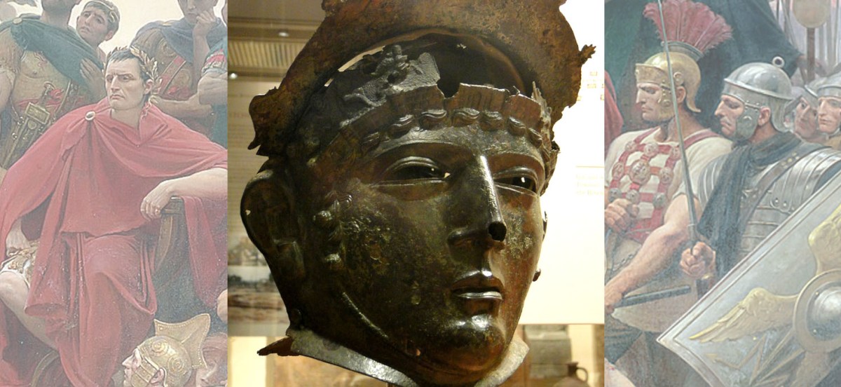 Gilded or silvered masks of iron, bronze or other metal alloys were typically attached to the warriors’ helmets, serving as marks of prestige while also offering Roman riders facial protection and outward visibility.