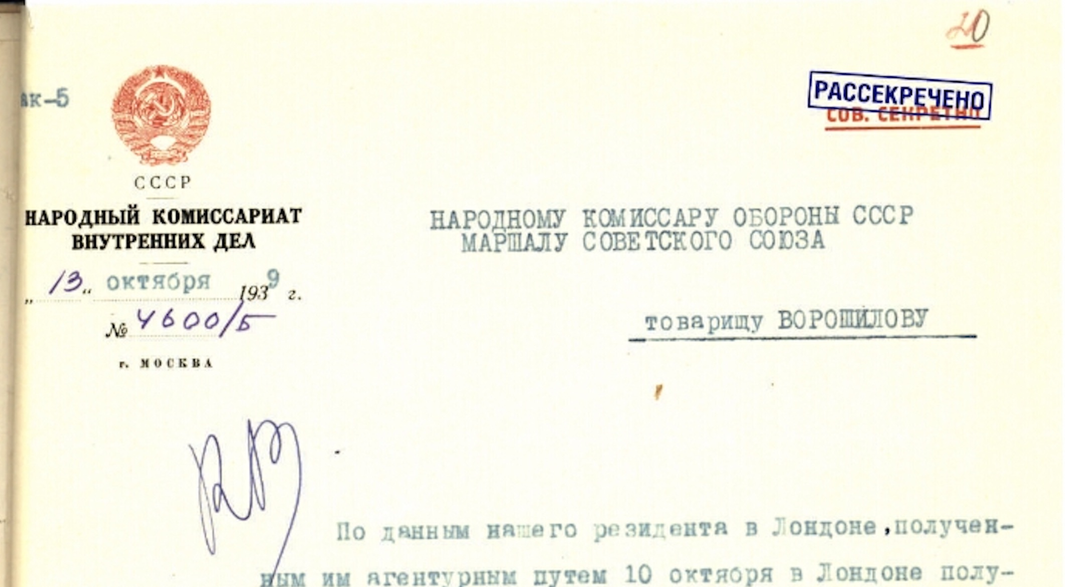 A 1939 secret message from Lavrentiy Beria, Soviet People’s Commissar of Internal Affairs, to Soviet military officer Kliment Voroshilov about the stance of Sweden, Germany and the USA in the event of a military confrontation between Finland and the USSR. The document is one of thousands of newly released files made digitally available by Russian state archives. (World War II in Archival Documents, Boris Yeltsin Presidential Library)