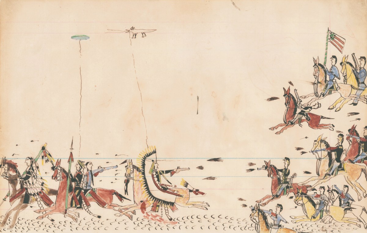 LEDGER DRAWINGS–SO NAMED BECAUSE THEY WERE MADE ON PAGES OF OLD LEDGER or account books—flourished as an art form among the Plains Indians in the second half of the 19th century. The drawings, made with pencil, ink, and watercolor, were a way for warriors to memorialize their deeds. Howling Wolf, a Southern Cheyenne warrior, is considered to be one of the most important ledger-book artists of the era.