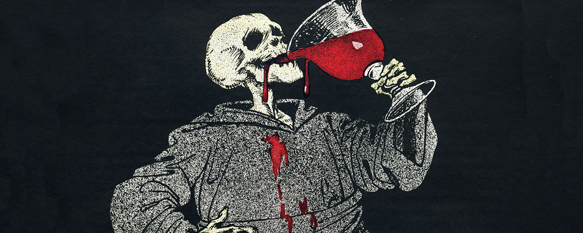 Raemaekers moved from restrained sorrow to biting commentary after the German army invaded neutral Belgium on August 4. As 400,000 Belgian refugees flooded into the Netherlands, bringing tales of atrocities committed by German soldiers, an incensed Raemaekers began to make drawings based on eyewitness interviews and photographs from the front. Within the first few weeks of hostilities, Raemaekers would produce some of his finest and best-known cartoons—images that would be reprinted many times in different publications and in different mediums throughout the Allied nations. In a cartoon published on August 18 and captioned “The Harvest is Ripe,” for example, Death cuts down the people of Belgium with a scythe as they attempt to defend themselves against the advancing German army. A September 20 cartoon titled “To Your Health, Civilization!” features a portly Death who quaffs from a goblet of blood as some of it slops down the front of his robe and onto the floor. In “Where are our fathers?,” published on October 8, a crowd of children, massed shoulder to shoulder, fill the space between two towering lines of crosses. They blur into a faceless, monotone crowd as they recede toward the flaming horizon, which provides the only hint of color.