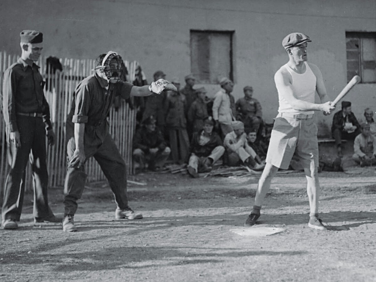 U.S. Maj. Gen. Claire Chennault, wearing shorts, takes a turn at-bat during an exhibition […]