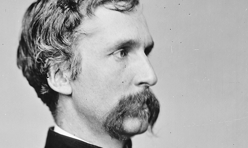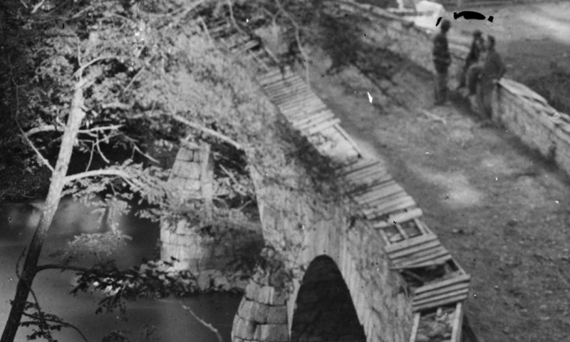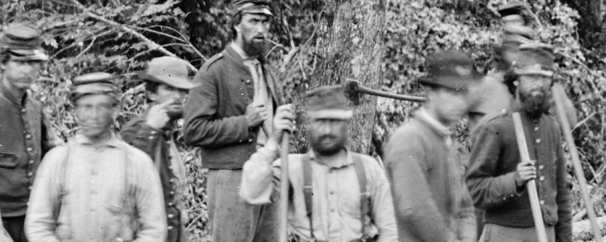 Union soldiers of the 5th New Hampshire infantry build a span known as the Grapevine Bridge across the Chickahominy River.