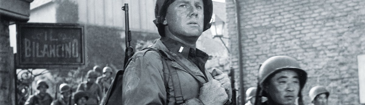Thus “the ugly flame of race prejudice” burns primarily in Grayson and, toward the end of the film, in some of his buddies in the 36th Division. The focus on the 36th is no accident. Historically, in October 1944, German forces in eastern France’s rugged Vosges Mountains cut off a battalion of the 36th, which elements of the 442nd save in a rescue that forms the film’s climax. Go for Broke! concludes with newsreel footage of President Harry S. Truman presenting the 442nd with a Presidential Unit Citation, followed by a final scene in which Grayson, now thoroughly converted from his misplaced prejudice, proudly marches at the head of his platoon.