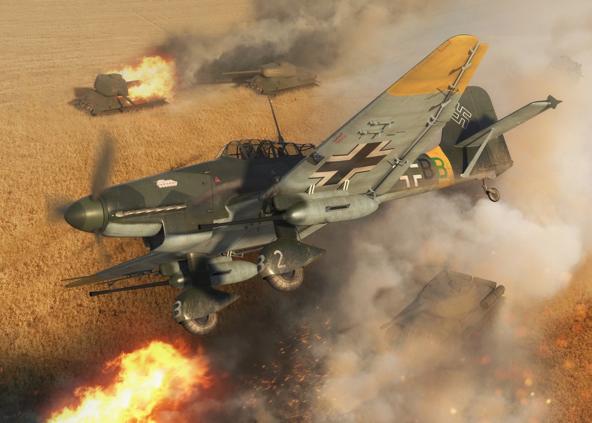 As Operation Citadel advances, Junkers Ju-87Ds overfly an advancing armored unit in the Belgorod-Oryol region as they return from a close support mission on July 10, 1943. (Imperial War Museum HU 40710)