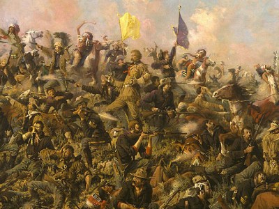 The battle opened with an attack on an Indian village. General Custer led one set of troops while Major [Marcus] Reno headed another.