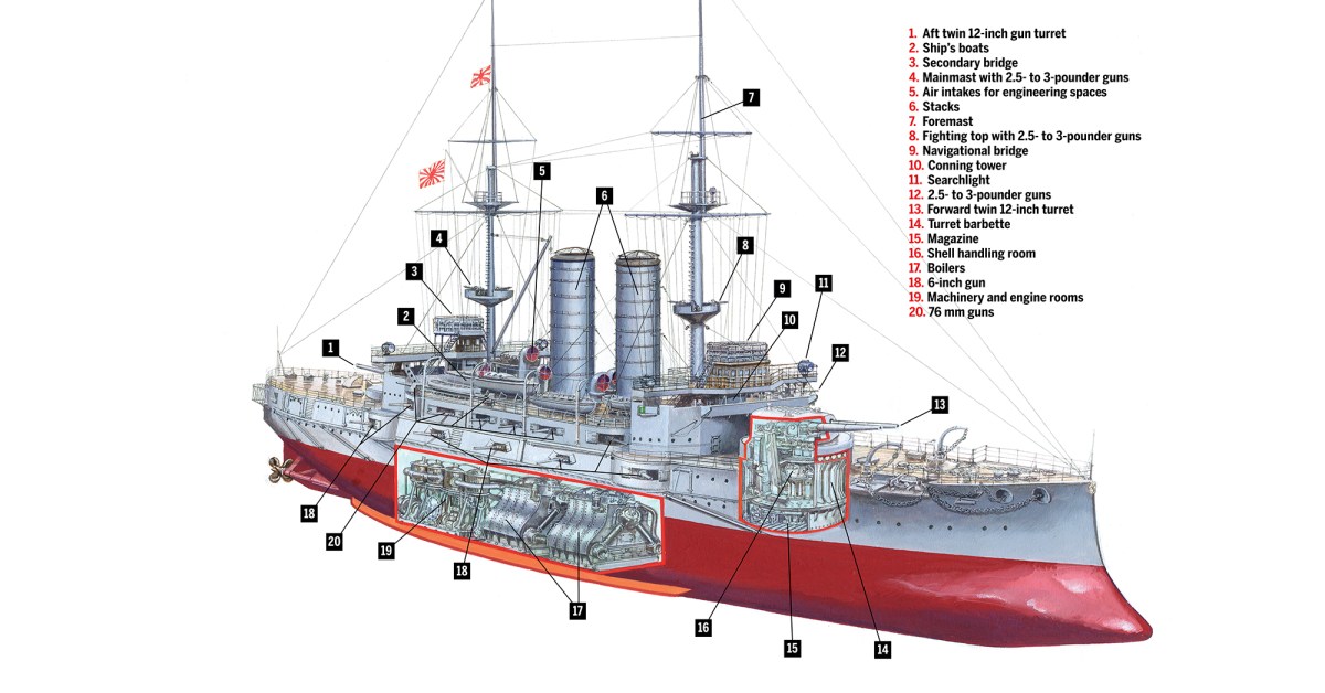 Laid down by Vickers in Barrow-in-Furness, England, on Jan. 24, 1899, launched on Nov. 8, 1900, and commissioned on March 1, 1902, Mikasa was the last of six modern battleships ordered from Britain by the Imperial Japanese Navy. While its five predecessors were protected by Harvey nickel-steel armor, Mikasa boasted the latest cemented steel armor from Krupp. On each of the six battleships the Japanese concentrated armor along the starboard and port main belt and in the gun turrets and forward conning tower rather than in the entire hull, as the Russians did on their warships, thus gaining 2 knots more speed. The armor was only 4 inches thick at either end, however, leaving the Japanese battleships vulnerable to mines. This led