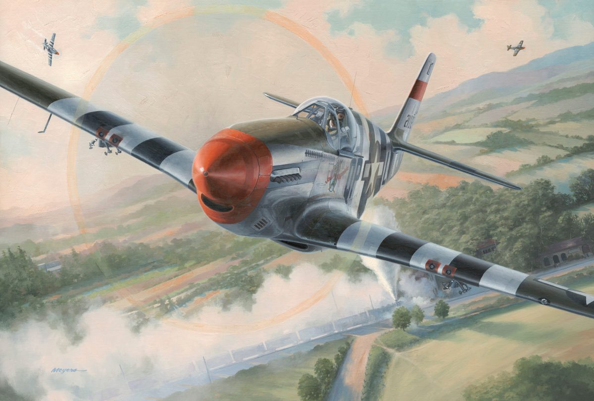 I flew a six-hour job today and led the squadron all the way. That is a much harder way to fly—there is no one to “fly on,” and at high altitudes over here, there isn’t much horizon. A lot of halfway instrument flying must take place. I’m at 178 hours now. The other day, I led a flight on a glide bomb job. I got an ammunition train in a marshalling yard. I put five of six right in the yard. The resulting explosions flamed at least 1,000 feet high. In the melee, I added two more nicks: one on a prop blade, one on the right wing. That’s the seventh in my plane now. The damn thing is getting quite patched.