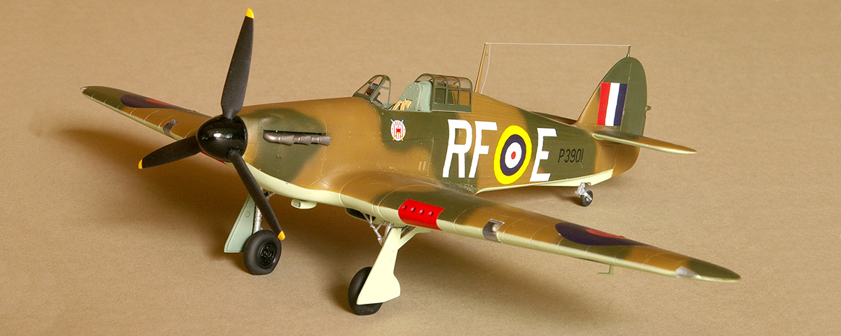 The wings have several cutouts for the various Hurricane versions. Make sure you use the eight Browning .303 machine gun inserts used on the Mk.I. The kit also provides a de Havilland spinner, so be sure to use the rounded Rotol version. Paint the prop blades flat black and the Rotol spinner and backing plate gloss blackHurricane Mk.Is were camouflaged with Sky, type S, undersides (FS-34424) and the topsides in a pattern of dark earth (FS-30118) and RAF dark green (FS-34079). Urbanowicz’s aircraft was probably painted in the British “B scheme” camouflage pattern. This pattern and all of the markings are included on the Sky Models decal sheet “Hawker Hurricane Pt. 1,” 48-051. Mask and spray the wheel wells RAF interior green and the areas around the gun muzzles insignia red (duplicating fabric coverings used to keep dirt out of the gun barrels).