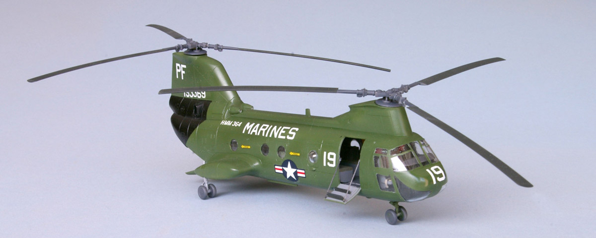 Kits for the Boeing Vertol CH-46 Sea Knight aren’t generally found on hobby shop shelves, but regularly show up online and at model swap meets. One of the easiest to find is the 1/72nd-scale Hobby Boss kit, number 87723. Though it’s simple to construct, it includes a detailed cockpit with controls for both pilots, instrument panels above and in front of the flight crew and nicely molded pilots’ seats. The only real drawback is the bench-style seats in the cargo area, which should have replicated fold-ups with canvas backs and bottoms.