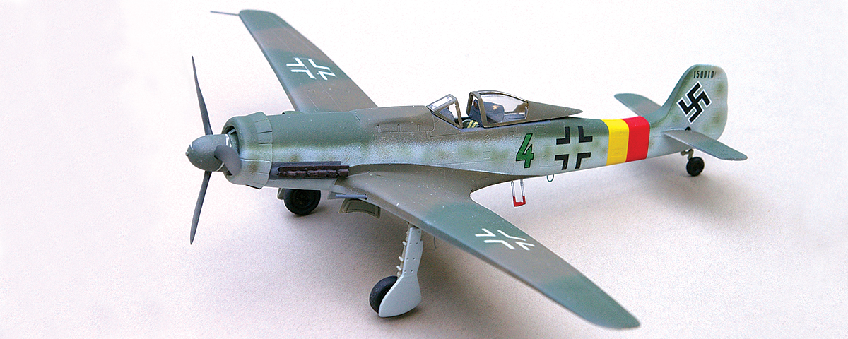 The kit’s decal sheet provides markings for a number of late-war Ta-152Hs. For reference, you can see a profile of a long-winged Ta-152—flown by Flight Sgt. Walter Loos, from Stab/JG.301, based at Neustadt-Glewe, Germany, in April 1945—on pages 120 and 121 of Luftwaffe Fighter Aircraft in Profile, by Claes Sundin and Christer Bergstrom. The wings and top sections of that aircraft’s fuselage were painted in a soft-edge camouflage scheme of late-war shades of “Braunviolet,” RLM-81, and “Dunkelgrün,” RLM-82. The undersides and a portion of the fuselage sides up to the canopy and vertical tail should be “Hellgrün,” RLM-83, splotched with the dark green and brown-violet. Home defense fuselage bands of red and yellow brighten the drab camouflage.