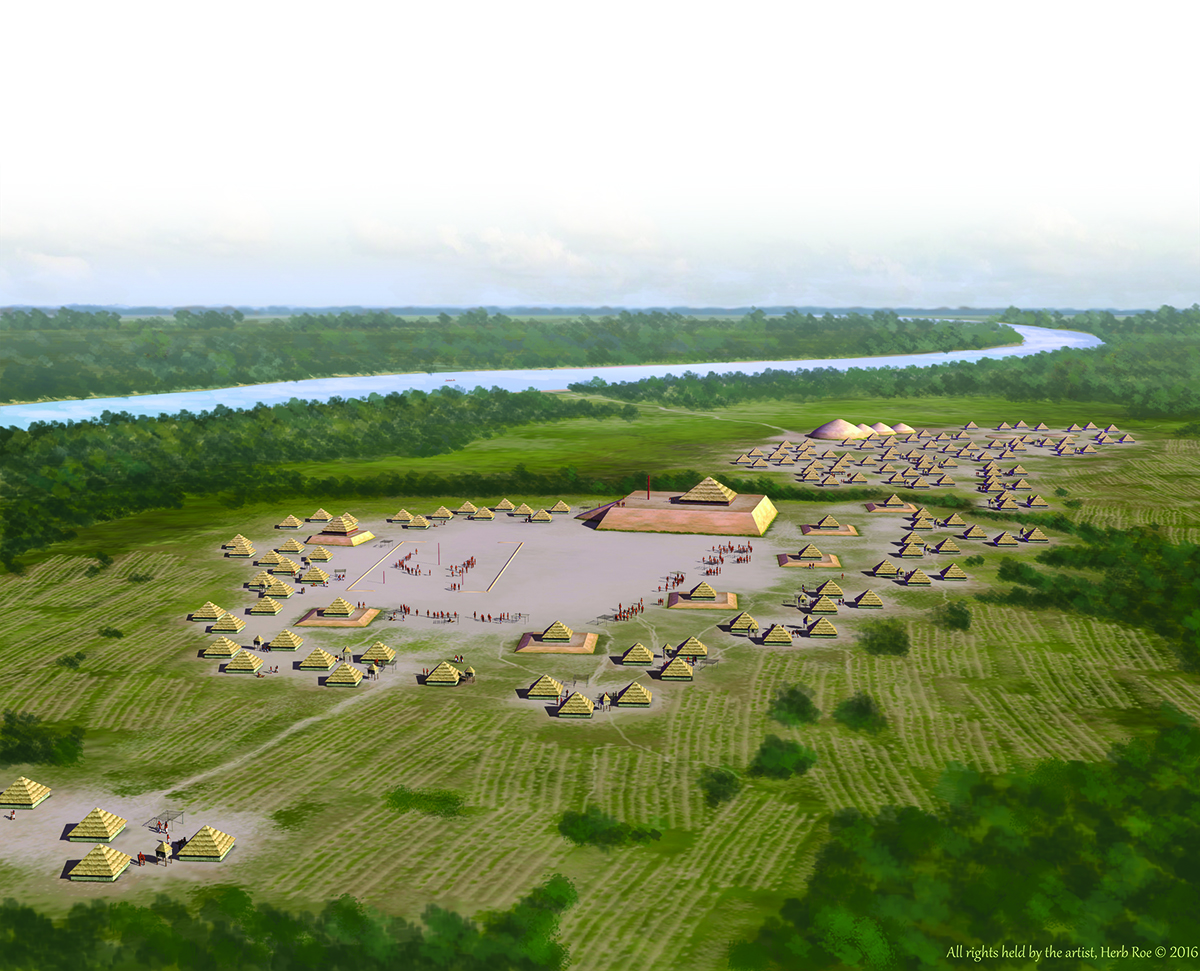 The largest of these cities was Cahokia, with an estimated peak population approaching 20,000. Sprawling across 6 square miles on the east bank of the Mississippi River immediately opposite present-day St. Louis, Mo., the city encompassed some 120 earthen mounds. Today 2,200-acre Cahokia Mounds State Historic Site centers on the largest surviving Mississippian earthwork, Monks Mound, which stands 100 feet high and occupies 14 acres. Its size is all the more remarkable when one considers the millions of cubic feet of earth brought to the site basketful by basketful. It was atop such mounds residents held religious ceremonies, proffered offerings and human sacrifices and interred the bodies of deceased nobles. Farmers, tradesmen and commoners alike built their homes—simple thatched huts—adjacent to these ceremonial mounds, while secondary plazas on the fringes of each settlement served as farmers markets.