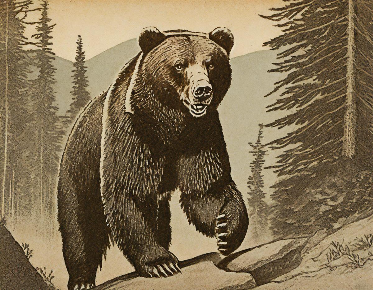 I looked up, hearing a slight rustling of leaves, and saw a big grizzly standing on a rock 12 feet above me. Instinctively I jumped back, crouching. He leaped and swept my rifle out of my reach. Realizing that in another second the brute would be upon me, I whirled about and made tracks for the gulch, with the bear a few feet behind.