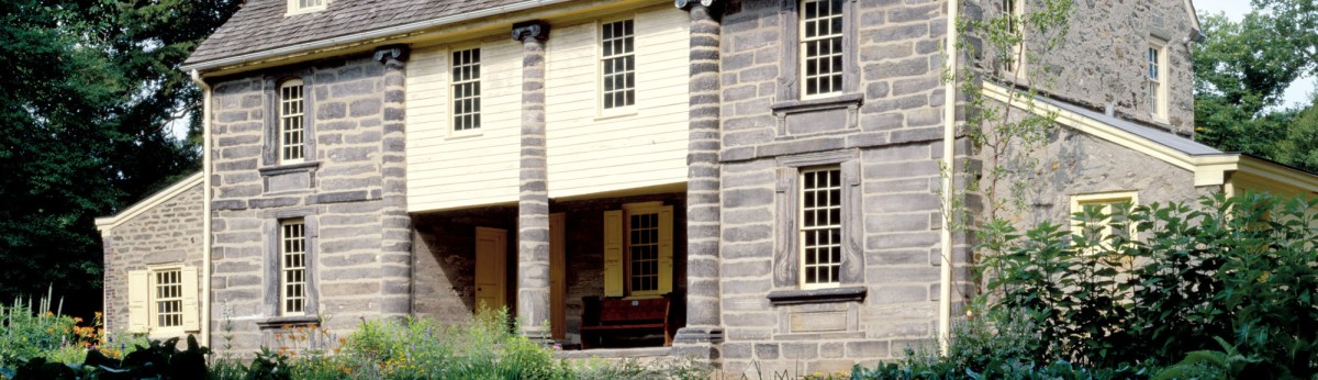 Some four miles south of Philadelphia, across the Schuylkill River from a squat row of oil refinery tanks, stands a terraced garden. The slope, dotted with shrubs, flowers, and towering trees, leads to an impressive house that glitters when sunlight strikes certain pieces of the stone it’s made of. Carved into the front of the house and dated 1770 are the words, “It is God Alone, Almyty, Lord/The Holy One by Me Ador’d.”