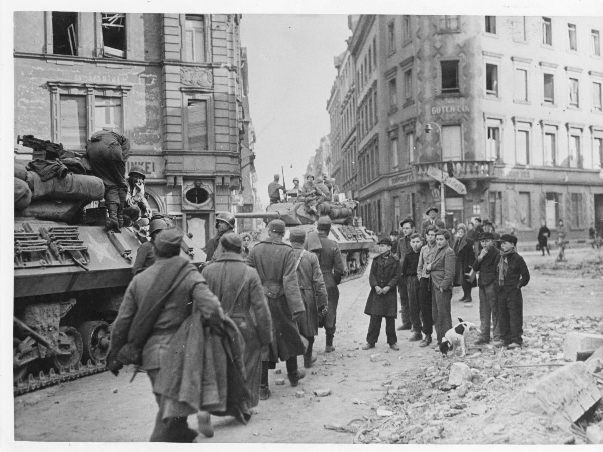 The single frame — taken in April 1945 at an unnamed German city — captures a slew of emotions. The victorious American tankers seem relaxed but not swaggering. The resigned German POWs are walking upright and don’t look dejected — probably grateful the fighting is over. They’re faceless in this photo; not so, though to the group of young boys in the foreground, looking on with confusion and concern. And the little terrier near them? Just business as usual.
