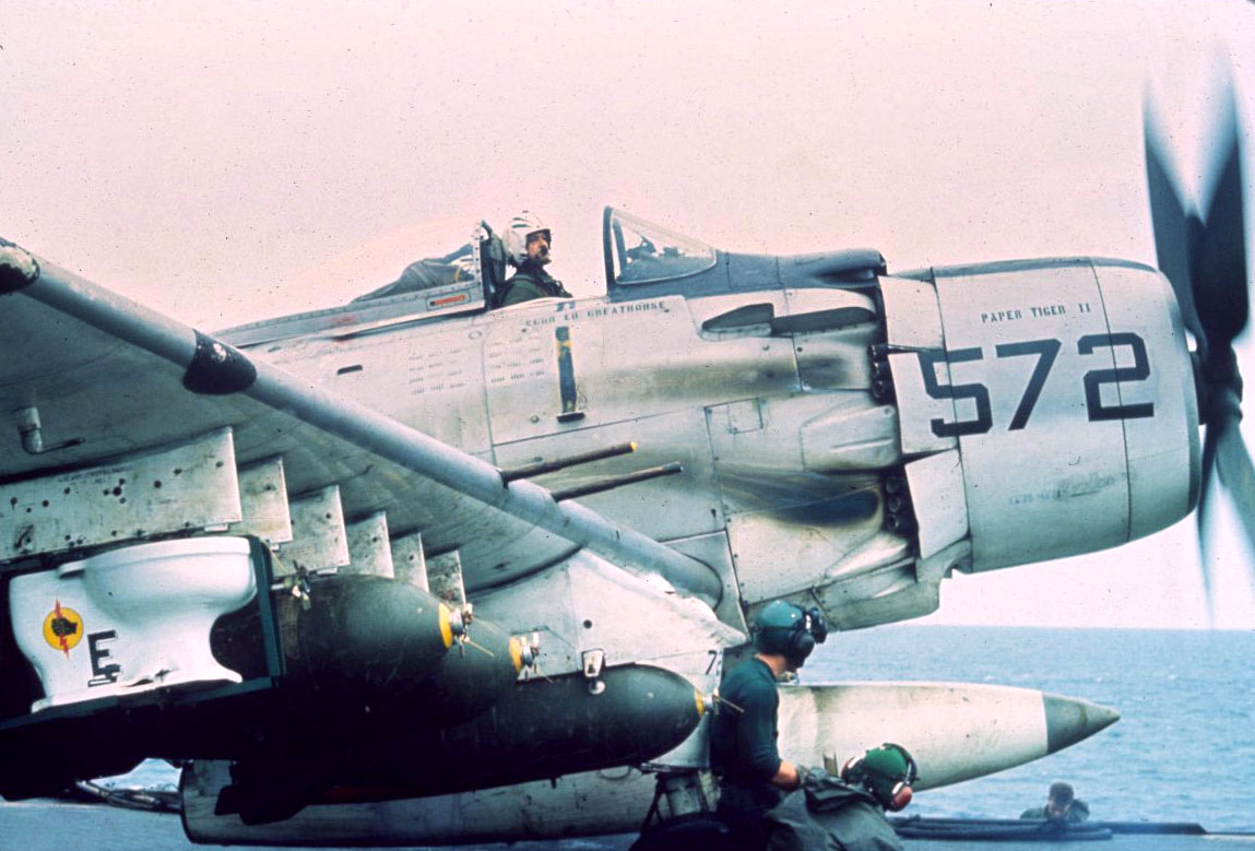 It all started when one of the plane captains rescued a damaged toilet that was just about to be heaved overboard. After the ordnance crew improvised a rack, tailfins and nose fuze for the john, it was “armed up” along with more conventional bombs on A-1H Skyraider NE/572, Paper Tiger II, flown by the squadron’s executive officer, Commander Clarence J. Stoddard. As Stoddard taxied onto the catapult, the flight deck checkers maneuvered to block the view of his specialized ordnance by the captain and air boss. But just as the Skyraider left the deck an irate transmission came from the bridge: “What the hell was on 572’s right wing?” By that time Paper Tiger II was on its way to a target somewhere on the Mekong Delta.