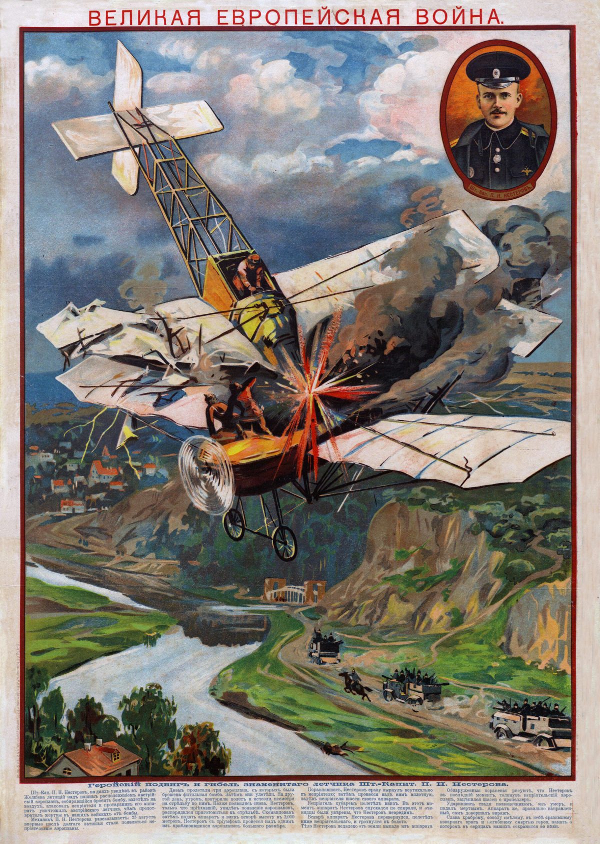 This Russian print, created in 1914, and titled “The Great European War: A Heroic Feat and Death of the Famous Pilot Staff Captain P. N. Nesterov,” depicts an incident from that year when Staff Capt. Pyotr Nikolayevich Nesterov deliberately rammed his Morane Saulnier Type G into an Austrian Albatros B.II over Ukraine.