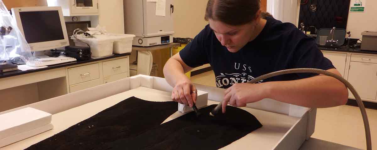 In 2009, museum staff began working to free the woolen fabric, using soapy baths to loosen the dirt and ultrasonic dental drills to delicately remove deposits. “It is a big artifact, and it was tedious work—and very tricky,” Sangouard says. A $20,000 donation from the Mariners’ Museum’s Bronze Door Society helped complete the conservation effort and pay for the climate-controlled cabinet.