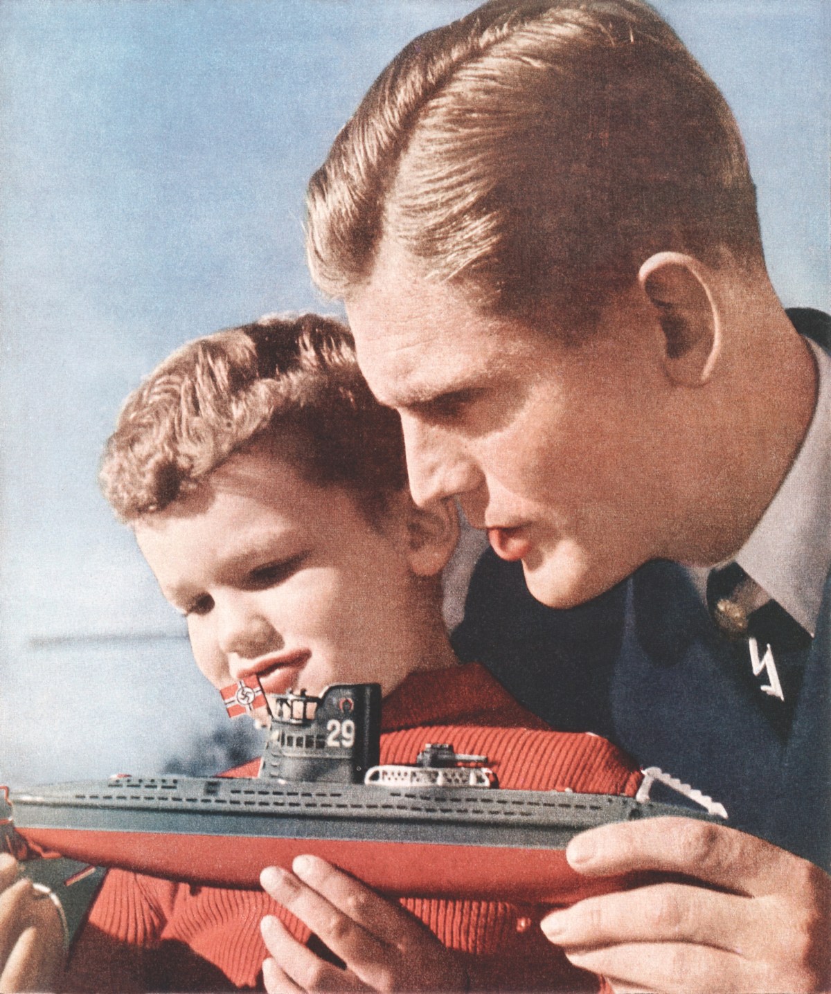This Brownshirt doll from the Bunker Museum of Hagen was made in 1935 and intended for three- and four-year-old children. Like many Nazi toys, the doll—in the dress of the early Nazi militia—features blond hair and blue eyes to advance the regime’s racial ideals.Nazi U-boat commander and war hero Joachim Schepke shows a model of a German submarine to a young boy in 1941. A constant onslaught of Nazi-themed toys created an environment where “children and youth accustomed to war games would volunteer for military service as early as age 15,” notes the Bunker Museum’s Michaela Beiderbeck. Nazi propaganda encouraged children to die for Hitler and the regime. (Galerie Bilderwelt/Getty Images)Board games such as “Vereint-gegen den Feind” (“United Against the Enemy”) were common playthings. During the war years, with German industries channeling their efforts into producing war materiel, toy manufacturers had access to paper products only. As the war dragged on, manufacturers’ resources further dwindled—as did their audience, with young boys and Hitler Youth deployed to fight.In the board game “Durch Kampf zum Sieg!” (“Through Struggle to Victory!”), players participate in the Nazis’ 1933 rise to power. Beiderbeck calls this game (pictured above and below) the rarest and most frightening item in the exhibit. “Hitler was always distinctly celebrated as the strong Führer and was also featured as a hero in scenes in children’s magazines, but this game literally revolves entirely around him on the playing board,” she says.