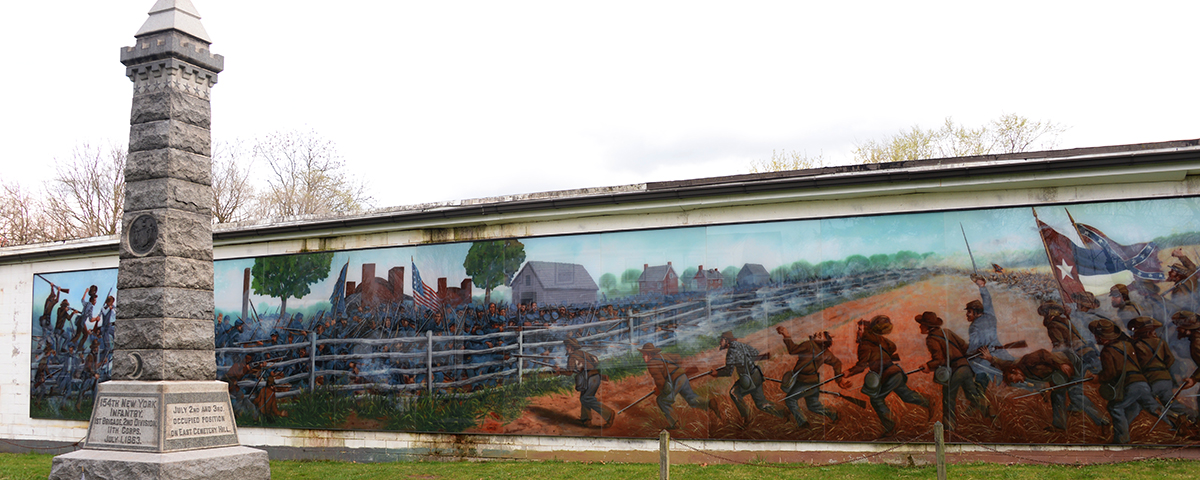 In 1890, veterans of the 154th New York erected a regimental monument on the site of the brickyard bloodletting. Over the years, the city of Gettysburg encroached around the monument and it became lost in the midst of urban growth. This is where Dunkelman again enters the story, this time as an artist. A visit to the brickyard site in 1970 revealed the monument backed by an 80-foot concrete wall of a roofing company. But Dunkelman envisioned something much grander.