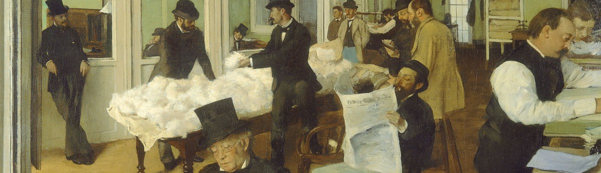 In Cotton Office, the foreground figure is top-hatted broker Michael Musson, the artist’s uncle, testing a fiber sample between thumb and forefinger beside a pile of cotton. Degas’s brother Rene is seated reading a newspaper; cousin Achille lounges against a window, observing as a broker and buyer examine samples. The men at right are working on the account books.
