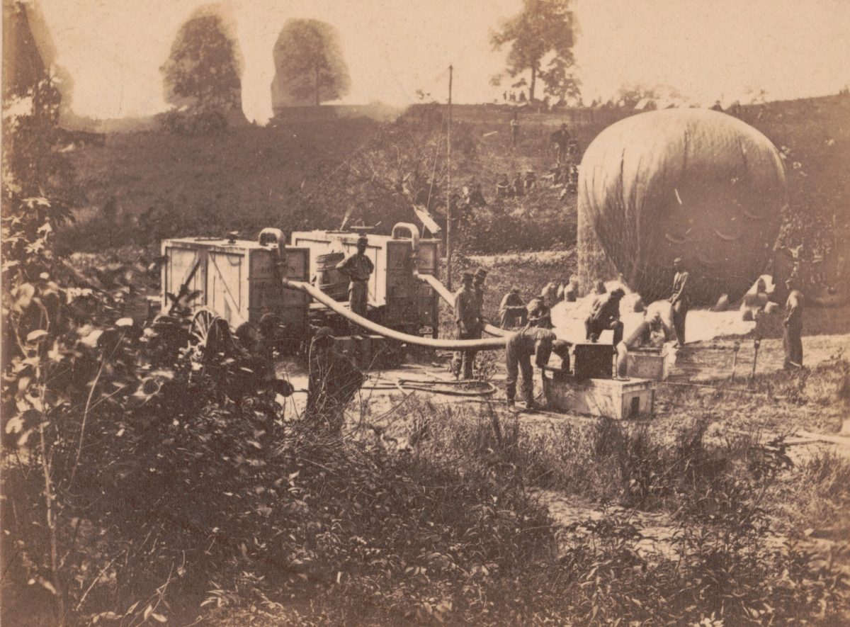 In this May 1862 photo, Lowe and Union soldiers are pictured inflating the balloon Intrepid from portable gas tanks to reconnoiter the Battle of Fair Oaks, May 31-June 1, 1862.