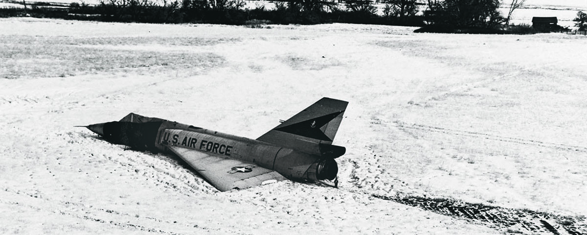 Fully coached on how to pull the power lever back to idle cutoff and turn off the master switch, the sheriff climbed the cockpit steps just as the F-106, its hot engine having melted the snow under the fuselage, began a jerky slide across the field. Now it was the sheriff’s turn to bail out. He decided waiting until all the fuel had been expended made more sense than playing instant jet pilot. Ultimately, the empty Convair traveled some 400 feet on its belly before it ran out of fuel. Pilot Foust, meanwhile, who was uninjured, was rescued by snowmobilers.