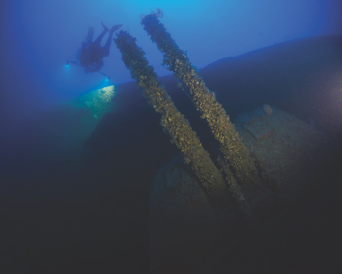 The aim of the June 2015 expedition was to assess the condition of the wreck and take extensive photographs, as well as to place the commemorative plaque. Despite having been underwater for more than seven decades, the ship was well preserved, its hull largely intact and main features clearly recognizable. The bow was in pristine condition, the forward twin gun turret undamaged. In the command station atop the bridge the divers were able to make out the range finder, compass, pelorus (a reference tool also known as a “dumb compass”) and a chart table. The ship’s stern was in far worse condition, as it had buckled when Kujawiak slammed into the bottom. The seafloor around the stern was littered with items torn from their deck fittings, including one of the warship’s quadruple-barrel 40 mm anti-aircraft mounts.