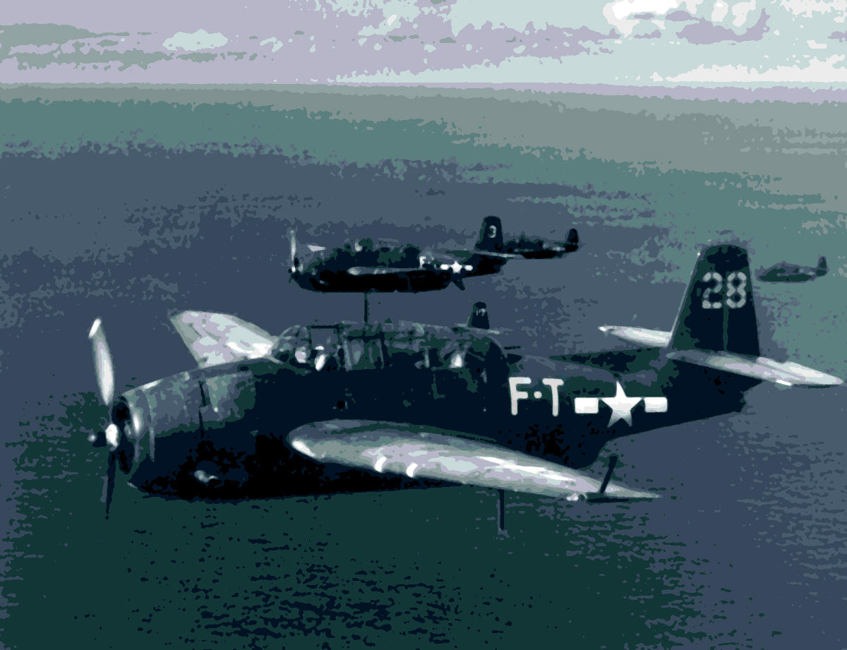 The Avenger’s wingspan was 54 feet. Its Wright Cyclone R-2600 engine developed 1,600 horsepower, giving the plane a top speed close to 300 miles per hour for 1,000 miles. The Avenger carried one standard torpedo or a 2,000-pound bomb. Armament included a .50-caliber machine gun under the forward cowl and another in a power-operated ball turret behind the cockpit. Each plane had a three-man crew–pilot, gunner and radioman.