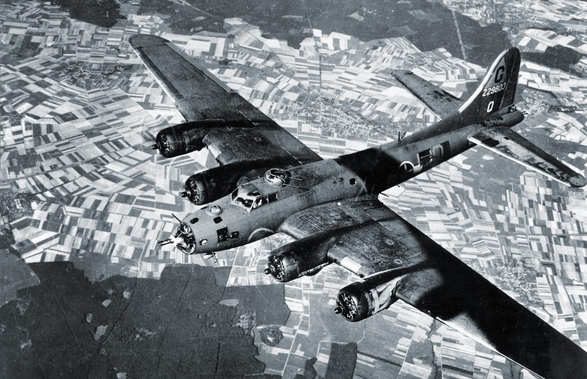 A Boeing B-17 Flying Fortress of the 365th Bombardment Squadron of the 305th Bombardment Group flies over England in February 1944. The American bomber was one of the “heavies” (along with the Consolidated B-24 Liberator) that the U.S. used to bombard Europe.