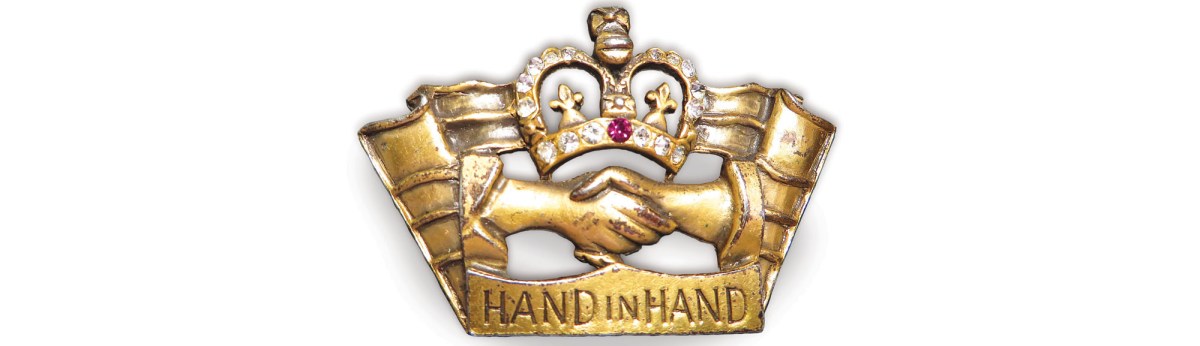 In my research, I could not find another example of this particular brooch. There’s little on the piece to indicate a specific time period—although the brooch’s grasped hands, motto, and St. Edward’s crown strongly resemble the logo of a long-lived London-based firm, the Hand in Hand Fire & Life Insurance Society. But neither a curator at the Museum of London nor an archivist for the insurance company has seen a pin like this, and both think it likely the pin has no connection to Hand in Hand, which ceased operating under that name in 1905.