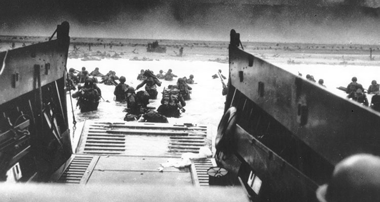 [dropcap]L[/dropcap]oudspeakers blared: “Fight to get your troops ashore…. If you’ve got any strength left, fight to save yourselves…. Away all boats!…. Our Father, who art in Heaven, hallowed be thy name….” At 5:50 a.m., the battleships Texas and Arkansas opened up. In Life photographer Robert Capa’s landing craft, which was nearing Omaha Beach, some men were bailing water frantically with their helmets. Others looked up at the heavy salvos flying over their heads and cheered. (See also: “I Stormed Ashore with Robert Capa on D-Day“)