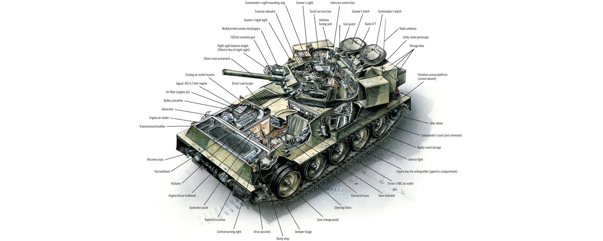 The Scorpion is armed with a 76mm cannon, but variants built atop its versatile chassis include the FV102 Striker antitank guided missile launcher, FV103 Spartan armored personnel carrier, FV104 Samaritan armored ambulance, FV105 Sultan command vehicle, FV106 Samson armored recovery vehicle and FV107 Scimitar recon vehicle with a 30mm L21A1 RARDEN cannon.