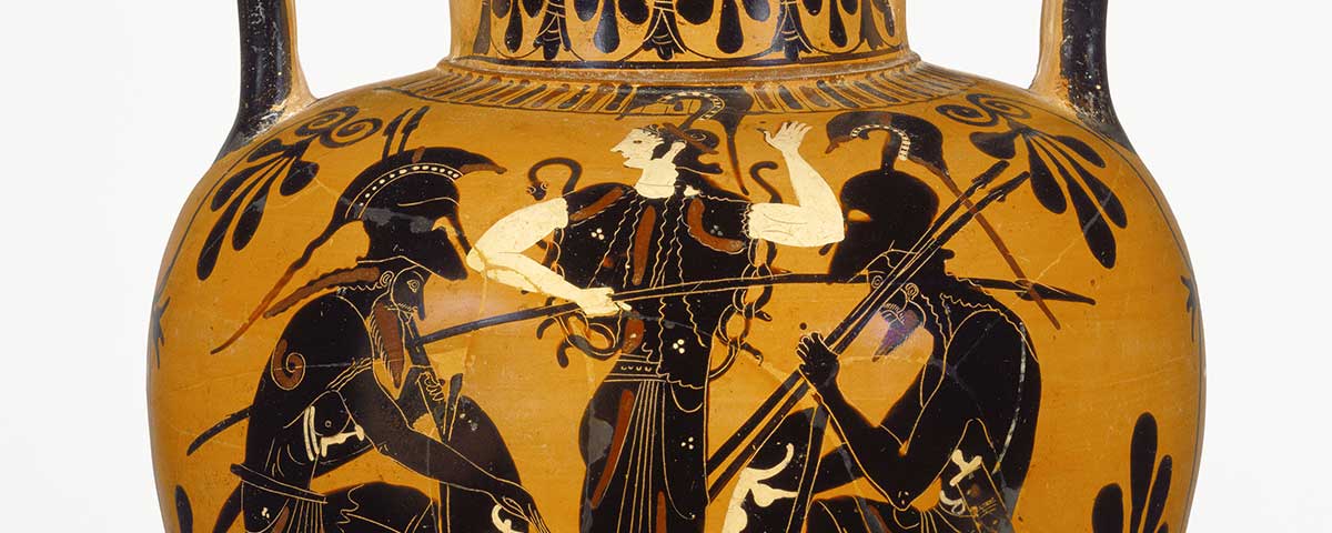 Aeneas, the Trojan hero and legendary founder of Rome, carries his father, Anchises, to safety during the sack of Troy. The goddess Aphrodite, Aeneas’s mother, waves sorrowfully to the group, which is lead by Aeneas’s son Ascanius. The painter of this 6th-century-BC amphora labeled all the people and included commentary on their beauty. (Leagros Group/The J. Paul Getty Museum, Villa Collection, Malibu)