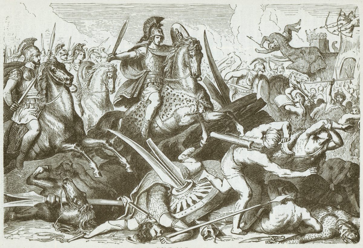 Darius then called his next shot. The main body of cavalry, a fighting force of roughly 8,000 commanded by his cousin, Bessus, thundered into the assault. Blade met blade as Greek infantry dodged the cavalry and absorbed the strength of a significant number of Darius’ best. The odds against Alexander’s Companion Cavalry, still awaiting its moment, were thereby reduced. Meanwhile, Darius launched his scythe chariots and sent his elephants into action. Alexander deployed his javelineers, whose missiles killed or disabled most of the chariot drivers before they had a chance to inflict any damage. While intimidating in size, the elephants did little more than create a manageable degree of chaos and interference—most of Alexander’s troops simply parted ranks and let the charging beasts pass.
