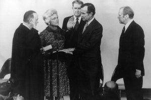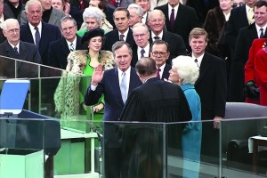 George Herbert Walker Bush takes the oath of office as the 41st President of the United States administered by Supreme Court Chief Justice Rehnquist Jan 20, 1989. (George Bush Presidential Library and Museum)