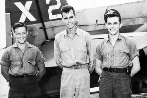 Lieutenant (j.g.) George H. W. Bush (center) with X-2 flight crew: radioman Joe Reichert (left) and turret gunner Leo W. Nadeau (right), November 2, 1944. Photo courtesy George Bush Presidential Library and Museum.