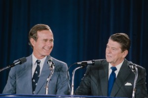 George H.W. Bush and Ronald Reagan at a press conference announcing Bush as vice president at the 1980 Republican National Convention, Joe Louis Arena in Detroit, Michigan, July, 1980. (Photo by Joe McNally /ABC via Getty Images)