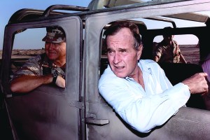 Former President Bush rides in an armored jeep with General Schwarzkopf in Saudi Arabia during the Gulf War, November 1990. (George Bush Presidential Library and Museum)