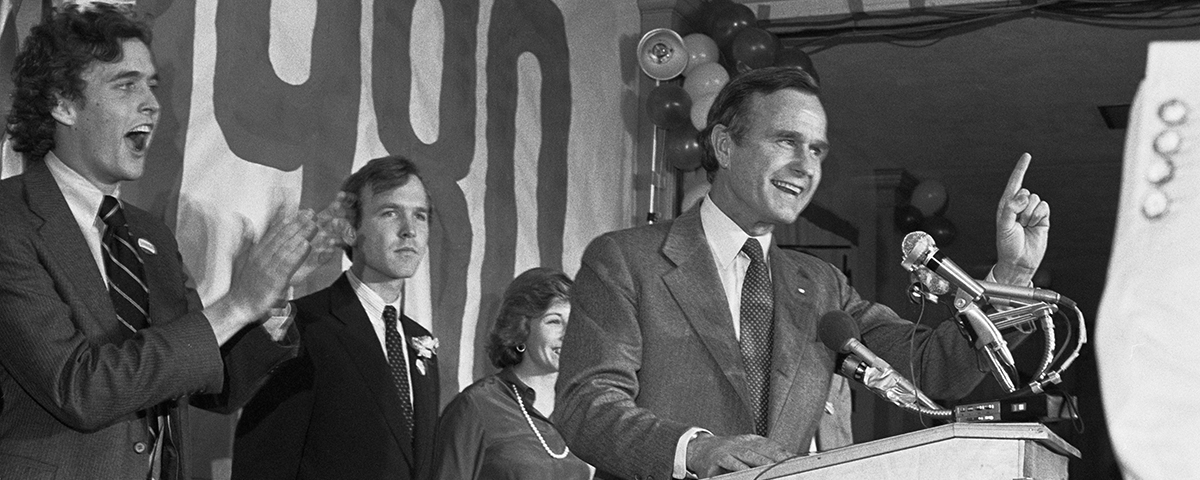 Concord, New Hampshire: Jeb Bush (L) loudly applauds his dad, Republican presidential hopeful George Bush (R) who tells his campaign workers he will battle on after conceding victory to Ronald Reagan in the New Hampshire presidential primary. Bush's other son Neil (2nd, L) and his fiancee Sharon Hart (C) of Nashua, N.H., look on, at New Hampshire Highway Hotel. ((Bettmann/Getty Images))