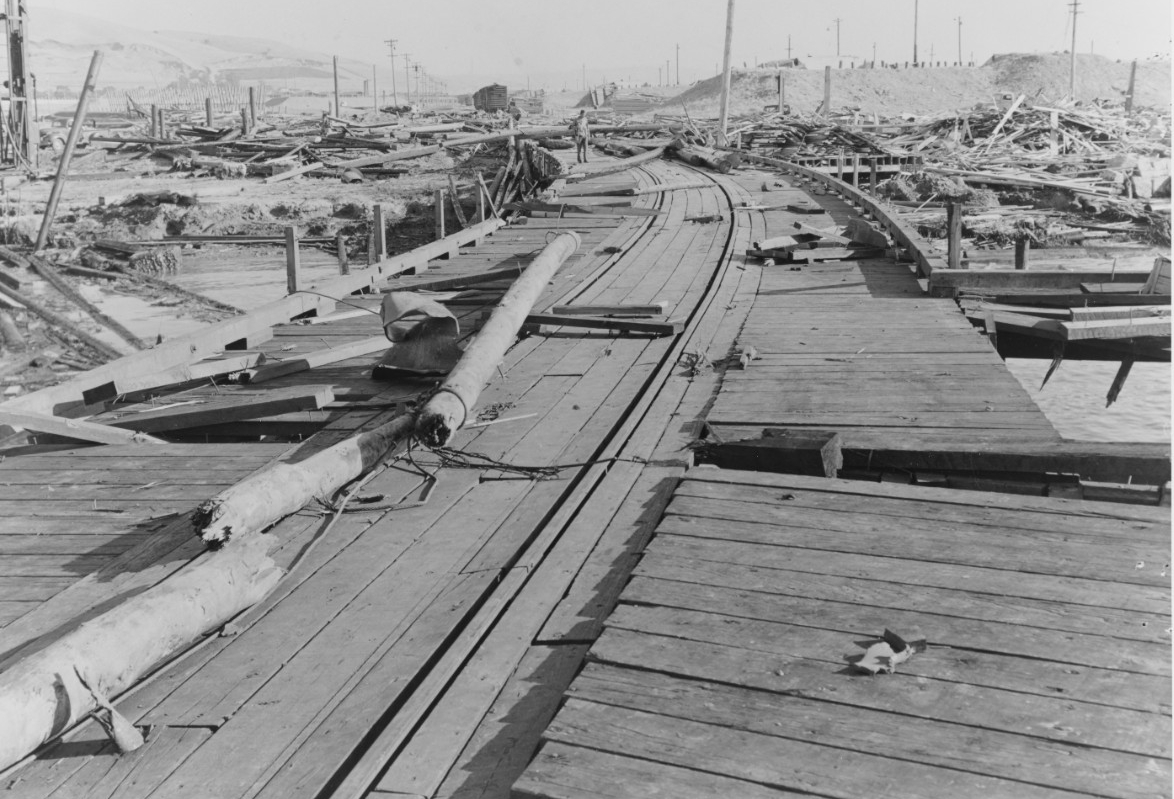 The men had already stowed some 4,600 tons of munitions aboard E.A. Bryan when, at 2218 hours, witnesses reported hearing “a metallic sound and rending timbers.” Seconds later a major explosion sent a pillar of fiery gases skyward. Following that were a few seconds of minor explosions and flames. Then the entire loading area went up in one massive blast: The pier, both ships, the locomotive and railcars, a nearby Coast Guard fireboat, all the cargo and 320 men all but vanished. Some 390 others, servicemen and civilians alike, were injured, mostly by flying glass shards and other debris as the blast wrecked nearly every building in Port Chicago. Smoke, gases and debris rose above 12,000 feet. The crew of an Army Air Forces plane cruising at 9,000 feet reported seeing pieces of glowing metal, some as large as a house, fly up past them. The blast was heard for 200 miles. The shock wave was felt in Nevada. Unexploded shells landed miles away.