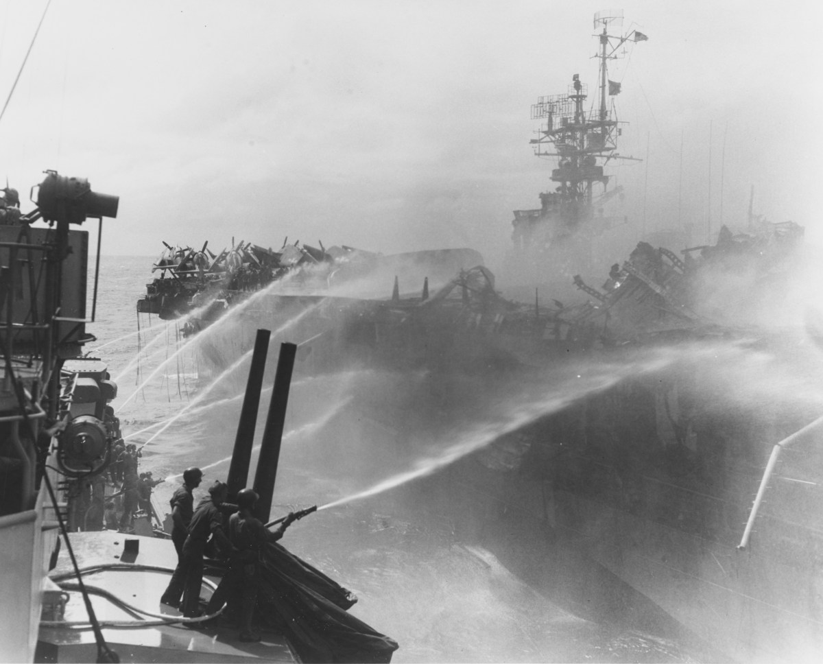 Pilots had not been assigned a ship’s function, so Mooney grabbed a fire hose and joined a group directing streams of water down into the forward elevator shaft, which was partially below the flight deck. Several other crewmen were similarly engaged when an incredible eruption blasted the elevator platform out of its shaft. Mooney was knocked backward but otherwise unhurt. In the hangar, the fire-sprinkling apparatus had completely failed, probably because the engulfing fire had destroyed the electrical circuitry that controlled the firefighting equipment in the hangar. Ten minutes after the bomb hit, Princeton began to drop out of formation.