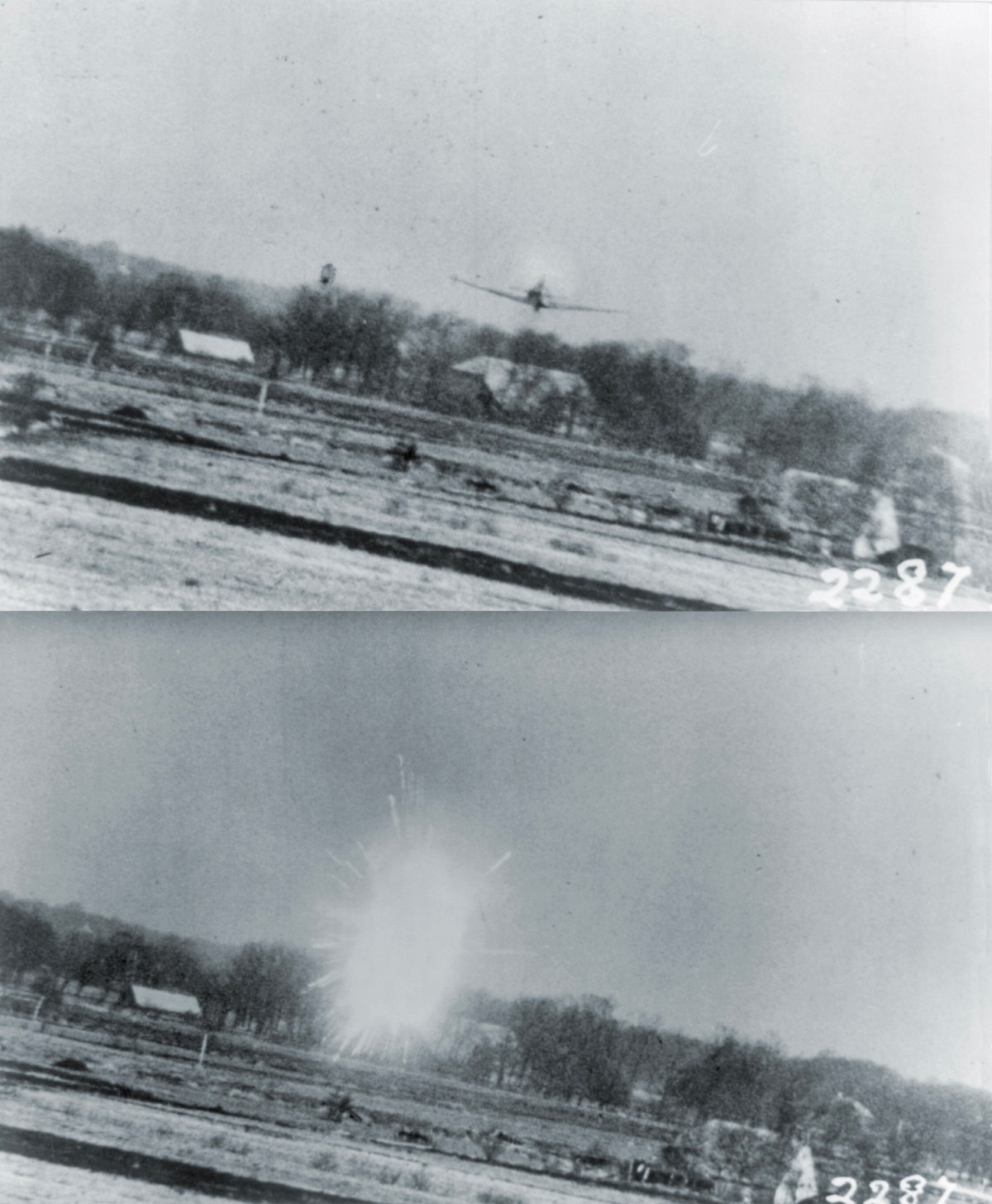 Gun camera footage documents the destruction of a German airplane that appears to be a Focke Wulf Fw-190 over Europe, probably in 1944. The split-second, fast-paced nature of air combat often meant that pilot memories alone were not dependable when determining what happened during encounters in the skies. Gun camera images like this provided a much more objective record. The British had tried gun cameras during World War I, but the devices came into their own during the Second World War when they were synchronized to begin filming whenever the pilot began firing his guns.